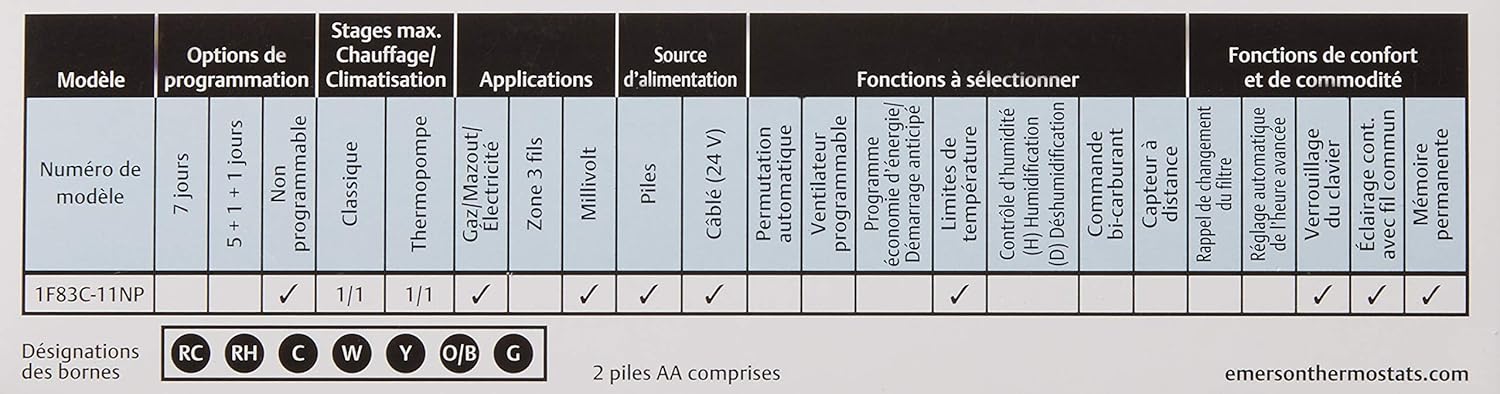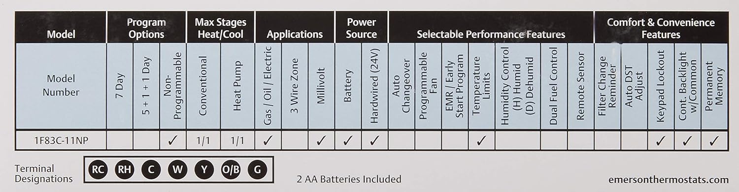 The Emerson 1F83C-11NP Conventional Thermostat is a reliable and easy-to-use non-programmable thermostat that is perfect for controlling the heating and cooling in your home. This thermostat is designed for use with a single heating and cooling system and features a simple interface with easy-to-read display. The white color of the thermostat will blend seamlessly with any decor. With precise temperature control and durable construction, the Emerson 1F83C-11NP is a great choice for keeping your home comfortable all year round.